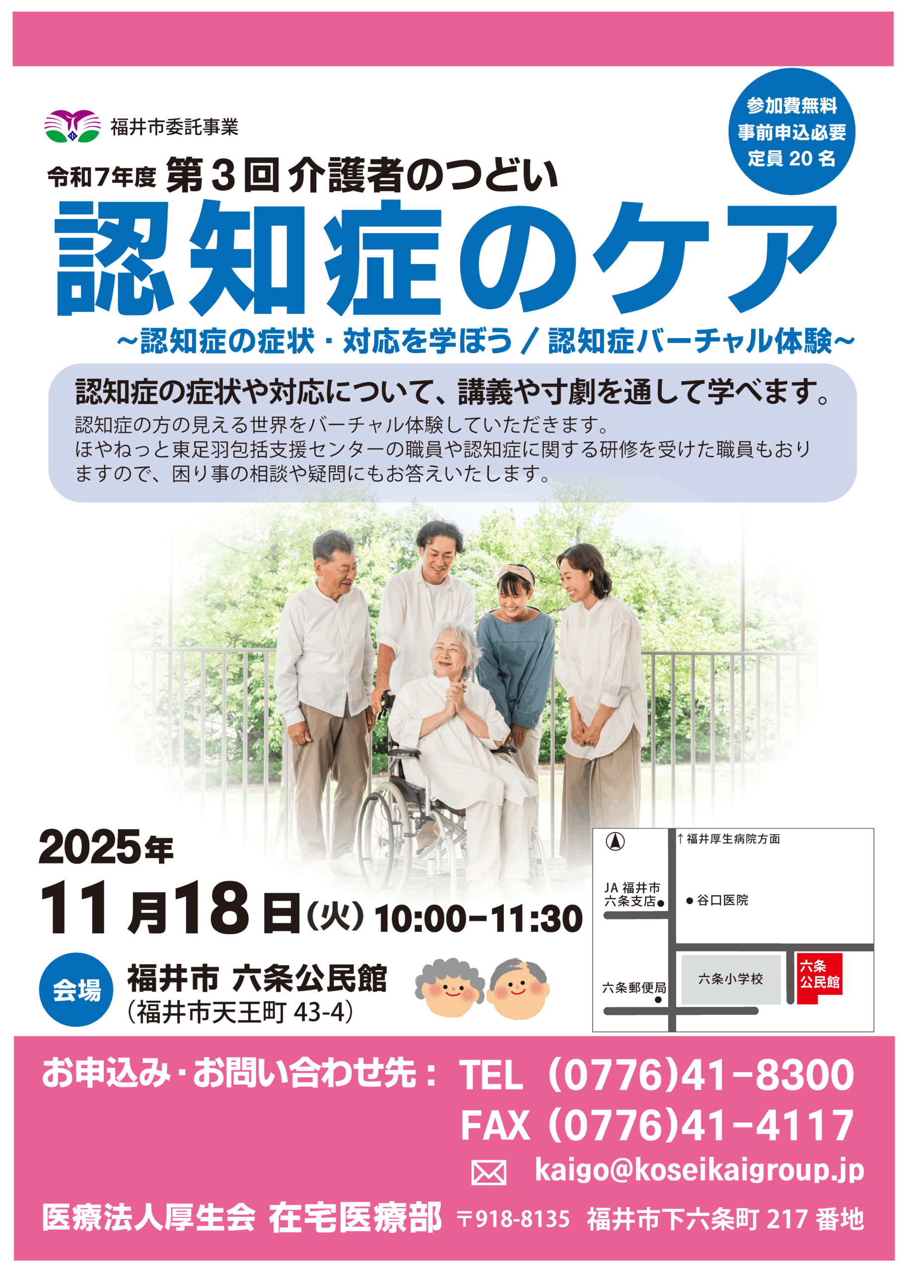 医療法人厚生会 在宅医療部 0776-41-8300 )にお電話いただくか、もしくは、メール kaigo(at)koseikaigroup.jp にてご連絡をお願いいたします。[※atは@に置き換えてください]