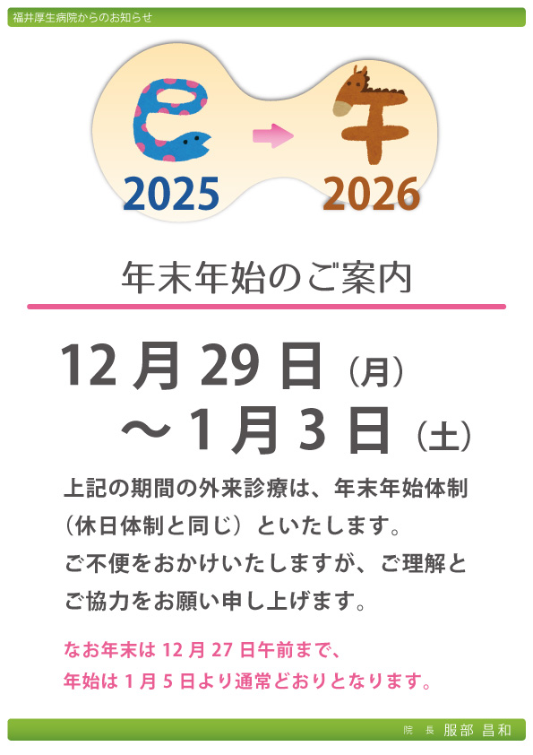 令和7年12月29日(月)から令和8年1月3日(土)まで年末年始体制といたします。