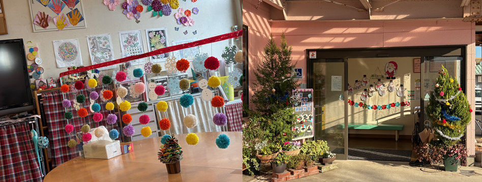 寒さが厳しくなる季節ですが、施設内は利用者さまの作品や冬の飾りで温かく彩られています。ほっと安心してお過ごしいただける環境づくりと、温かい日常のひとときを大切にしています