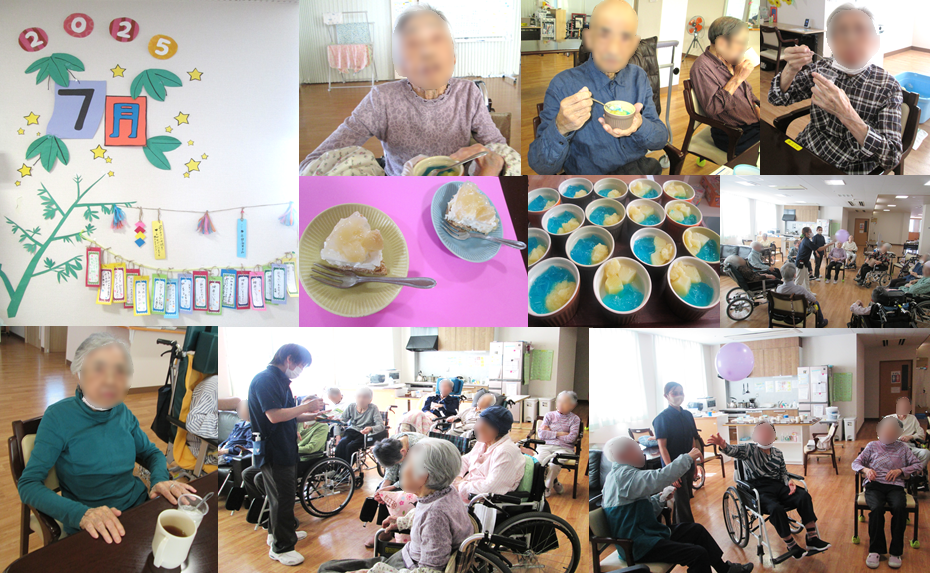 7月7日に七夕会を開催。短冊に願い事を書いていただき、発表しながら飾りつけをしました。ほかの利用者さまや職員の願い事を聞いて、大笑いする一場面も。七夕に関するお話やクイズ、星飛ばしゲーム、歌など楽しまれました。おやつには青色の七夕ゼリーを。涼しげな見た目も「キレイやし、美味しい」と喜んでいただきました