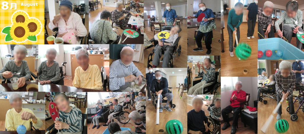 8月後半は夏祭りを開催。うちわを作成したり、盆踊り(イッチョライ節)を歌に合わせて踊ったりしました。うちわは「かわいくできたわ」と満足され、お席やお部屋に飾っていただいています。男性はねじり鉢巻き、女性はお化粧をして普段と違う雰囲気の中、ヨーヨー釣りやビーチボールを使用したスイカ割りを楽しんでました。口紅を塗る時には照れ臭そうにされる方も。おやつは桃と柚のゼリーを提供。「甘酸っぱくて美味しいわ」と冷たいお菓子に舌鼓を打ってらっしゃいました。