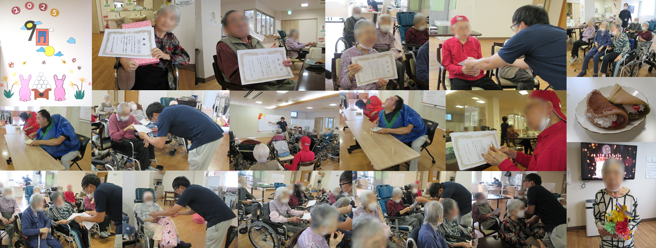 敬老会を行いました。敬老にちなんだ3択クイズを行い、長寿のお祝いとして表彰状をお渡ししました。皆さん、とても喜んでくださいました。米寿、卒寿と節枝の年齢になる方がいらっしゃったので、プレゼントもお渡ししました。